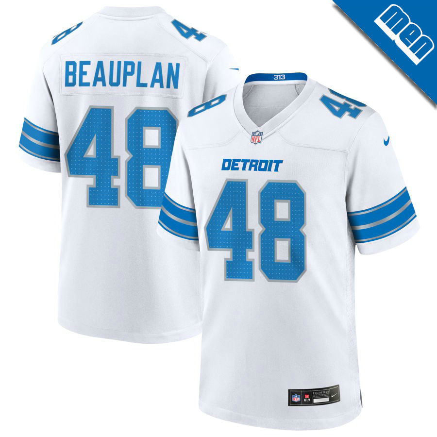 Rock the same colors as your favorite Lions player with this Abraham Beauplan #48 Detroit Lions White Game Men's Jersey. Made with premium breathable fabric featuring sewn-on numbers and team logos, this jersey delivers true gameday authenticity. As Abraham Beauplan leads the Lions' high-powered offense, show your pride with this must-have collector's item built to last through every touchdown celebration.