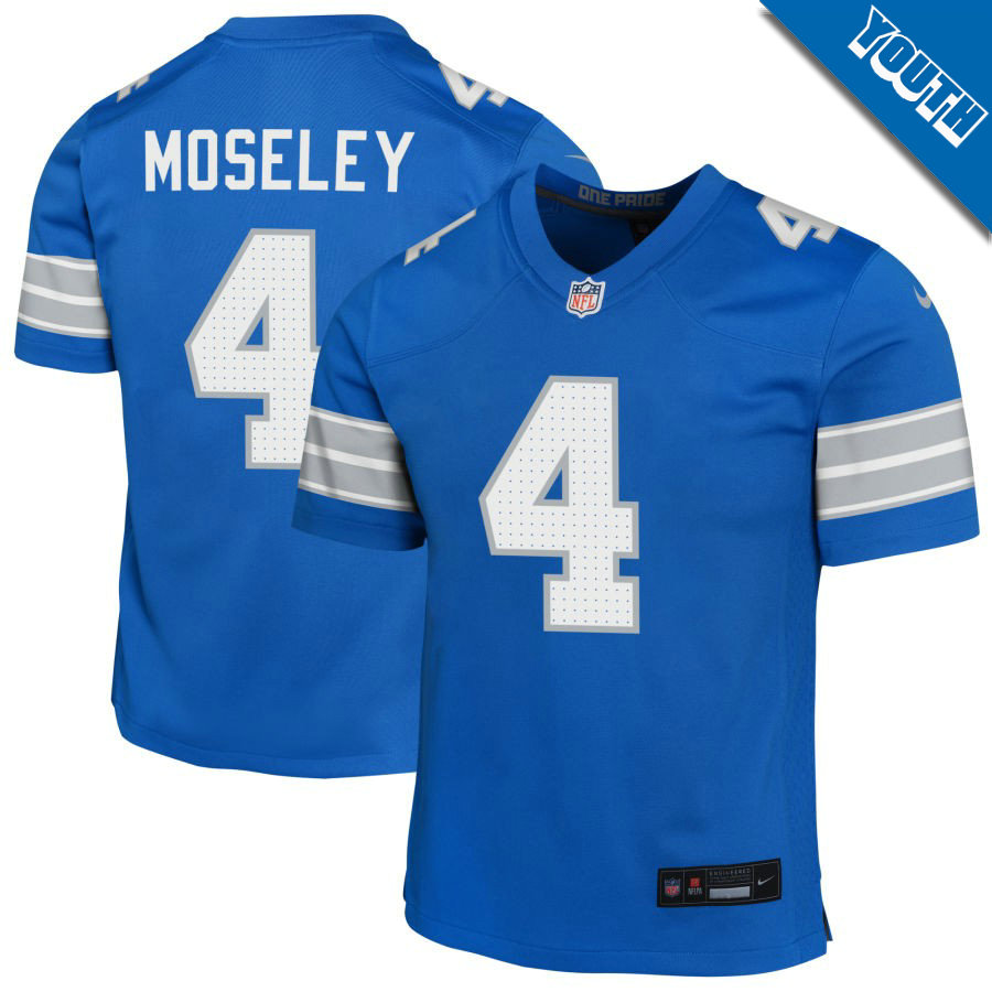 Gear up with the only jersey that truly counts: officially licensed Emmanuel Moseley #4 Detroit Lions Blue Game Youth Jersey. As Emmanuel Moseley steps into the spotlight to command the Lions' high-powered offense this season, represent your player and the roar of Detroit with unmatched legitimacy. Available in all sizes for every Lions supporter, it's the definitive way to embody the passion and promise of this thrilling new era in Detroit football.