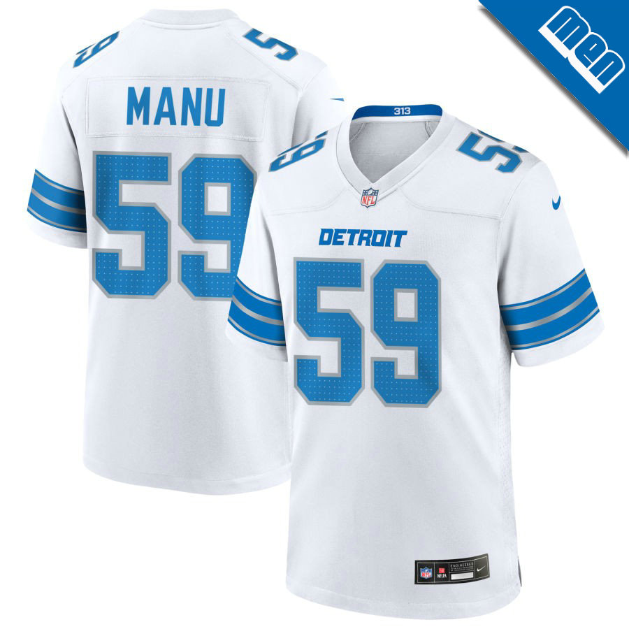 Rock the same colors as your favorite Lions player with this Giovanni Manu #59 Detroit Lions White Game Men's Jersey. Made with premium breathable fabric featuring sewn-on numbers and team logos, this jersey delivers true gameday authenticity. As Giovanni Manu leads the Lions' high-powered offense, show your pride with this must-have collector's item built to last through every touchdown celebration.