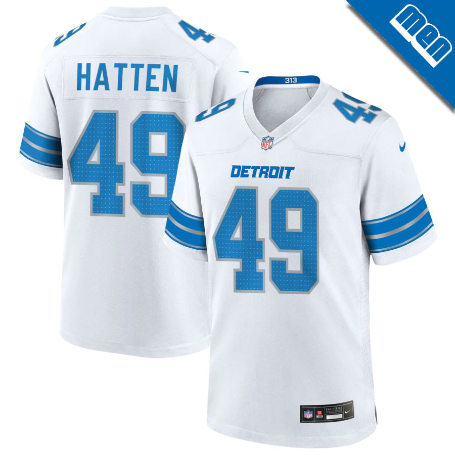 Rock the same colors as your favorite Lions player with this Hogan Hatten #49 Detroit Lions White Game Men's Jersey. Made with premium breathable fabric featuring sewn-on numbers and team logos, this jersey delivers true gameday authenticity. As Hogan Hatten leads the Lions' high-powered offense, show your pride with this must-have collector's item built to last through every touchdown celebration.