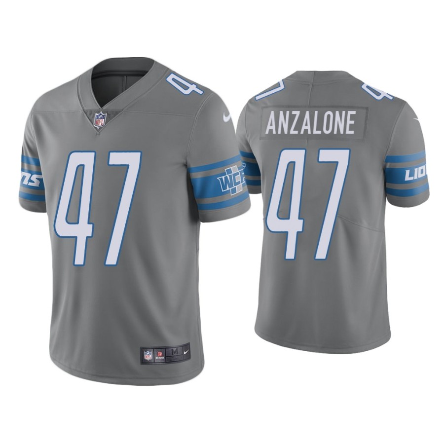 Look and feel like a big leaguer when you wear the cheap Lions Alex Anzalone Steel Color Rush Limited Jersey. It features a comfortable polyester design with quality Detroit Lions and Alex Anzalone embroidered graphics that will quickly make this Alex Anzalone Jersey one of your favorites.