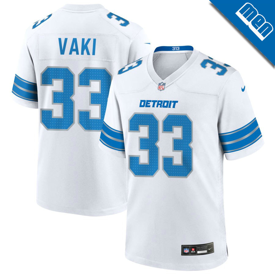 Rock the same colors as your favorite Lions player with this Sione Vaki #33 Detroit Lions White Game Men's Jersey. Made with premium breathable fabric featuring sewn-on numbers and team logos, this jersey delivers true gameday authenticity. As Sione Vaki leads the Lions' high-powered offense, show your pride with this must-have collector's item built to last through every touchdown celebration.